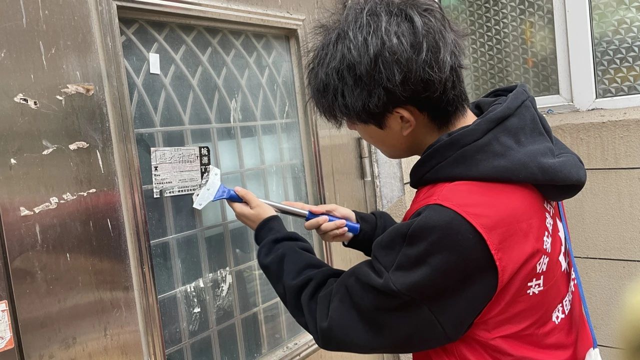 活动开始,志愿者们兵分多路,深入小区各个楼道,对卫生死角和野广告进行了全面清理。楼道里,志愿者们认真清扫地面的灰尘与杂物,不放过任何一个角落。面对墙壁、楼梯扶手上形形色色的野广告,他们或是用小铲子仔细铲除,或是用清洁剂反复擦拭,想尽办法恢复墙面的整洁。尽管天气寒冷,但大家热情高涨,干劲十足,现场一片热火朝天的景象。