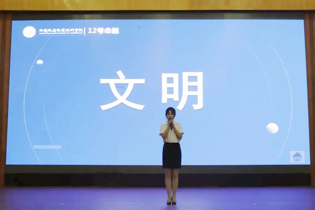 主持人的舞台应变能力是很重要的选手们按照抽签选出的关键词作出了即兴语言表述不慌不忙、落落大方展示了自己过硬的主持功底。