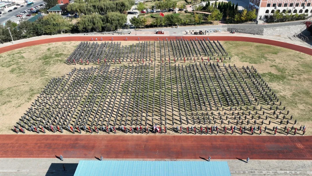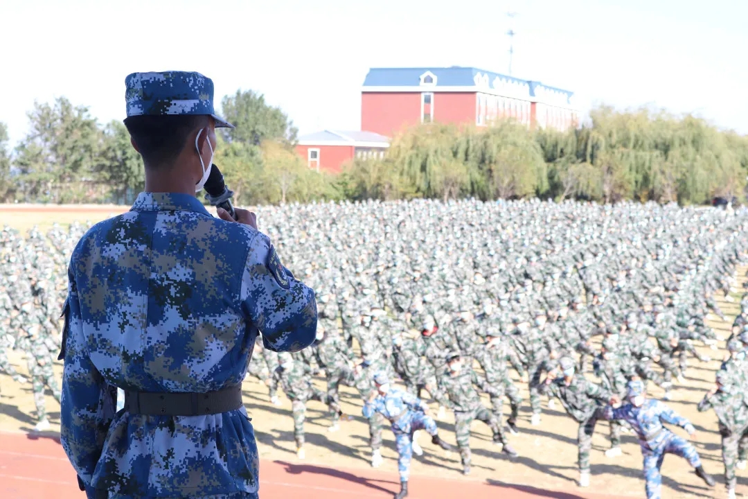 56支方队伴随进行曲,依次走向主席台接受检阅,“向右看!”教官响亮发令,指挥着方阵看向主席台,叶子们目光坚毅,军姿飒爽挺拔,步伐整齐划一,口号刚毅嘹亮,高悬的太阳照亮,叶子们大学生活全新的篇章。
