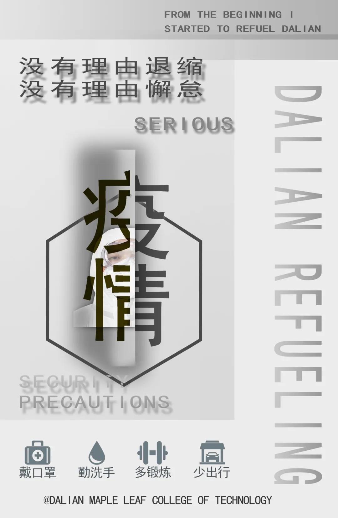 作品简介:围绕大连疫情为基础从而进行的海报设计,以在疫情期间要戴口罩、不聚集、勤洗手为主要体现方式,目的是要让大家注重防疫的重要性。