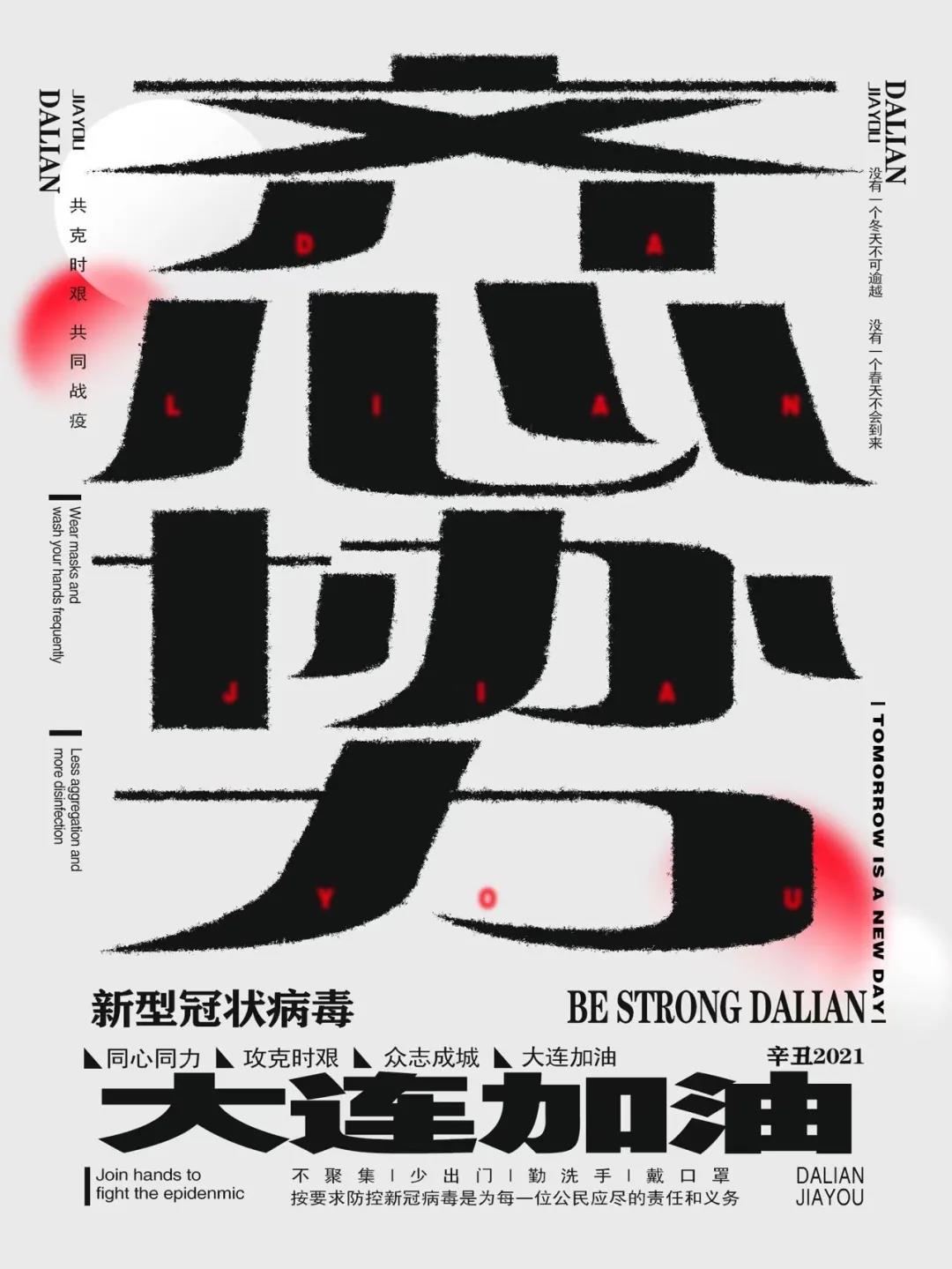作品简介:由于大连本次病毒传染力强以及危害传播快为设计出发点,所以相应的“DALIANJIAYOU”(大连加油)用红色写在“齐心协力”上;选择饱和度相应高的红色,同时红色也是警惕性高的颜色以及圆形在视觉上具有收缩性可以把人的视觉焦点聚焦在圆心,有效吸引人的注意力,所以用了圆形以此达到吸引人的注意力和提高警惕性。只要“齐心协力”,爱和希望就会比病毒蔓延的更快。