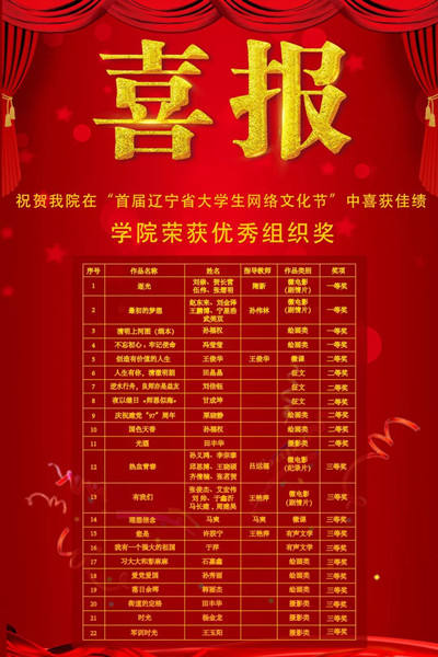 本届大学生网络文化节包括主题征文、微电影大赛、摄影比赛、演讲比赛、公益广告大赛等 16 项主题活动,历时七个月,参与活动高校数量达 76 所。我院高度重视,周密部署,广泛发动,积极参与,引导大学生积极创作优秀网络文化作品,传播网络正能量,弘扬网上主旋律,为推进社会主义核心价值观网上传播、凝心聚力共筑中华民族伟大复兴中国梦贡献力量。经过紧张激烈的报送、评审、遴选等环节,我院22件作品在全省各高校6214 件作品中脱颖而出,荣获4个一等奖、7个二等奖、11个三等奖,学院荣获优秀组织奖。