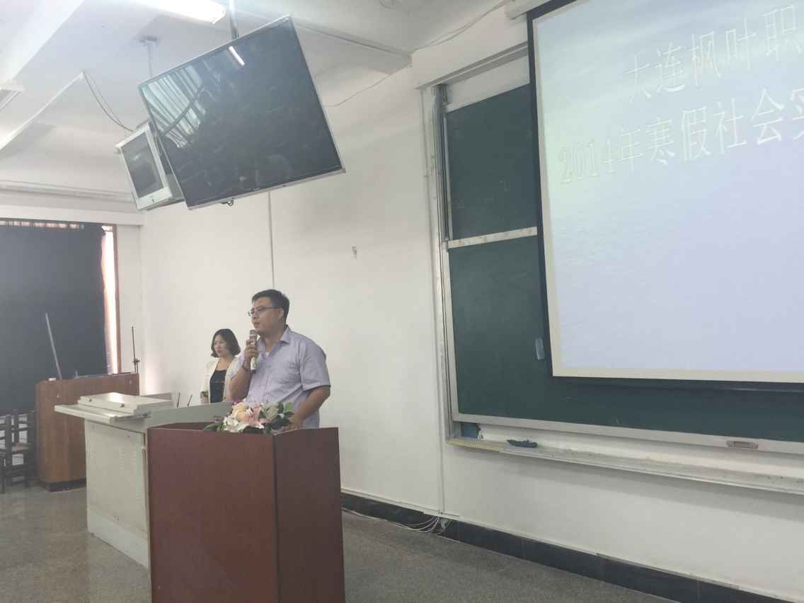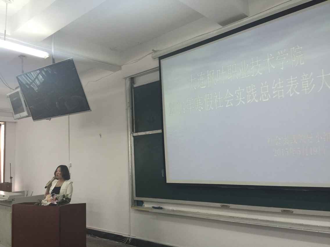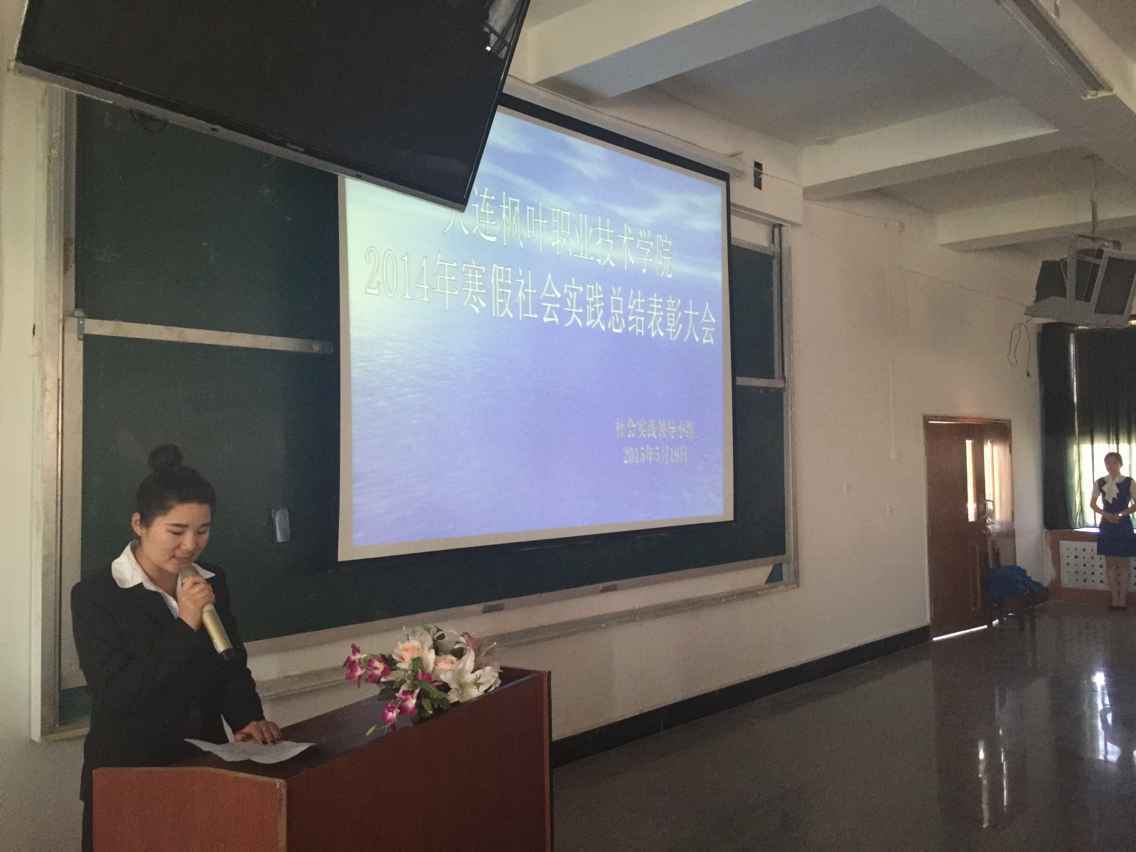 寒来暑往,万象更新,在这阳光明媚充满希望的大好时节我院2014年大学生寒假社会实践活动已圆满落下帷幕。2015年5月19日,在一号教学楼西多媒体教室隆重举行大连枫叶职业技术学院2014年寒假社会实践总结表彰大会。莅临本次大会的领导和嘉宾有:我院驻上海社会实践基地指导老师叶晓明,学生处处长高成林,就业指导中心主任张晓洁,通关系团委书记赵坤,船舶与珠宝系团委书记隋新,本次大会由院团委书记成名主持。到场的还有此次社会实践的优秀个人和14级新生代表。