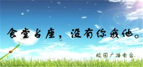 在人海茫茫的食堂中,你不断搜寻,终于找到了一似有似无的空位,你如饥似渴的冲过去,可是,你却发现座位上有一本不知谁的放的书,瞬间的你心都凉了。由于用餐时间比较集中,食堂占座是一个普遍现象,但确是不文明的行为。为了方便同学们的就餐,我们应该避免这种行为的发生。天气变得越来越冷,丢壶事件越来越频繁,其中的缘由大家都可以相互理解的。但是,希望大家从自身做起,杜绝这种不文明行为的发生,建立良好的校园文化环境。