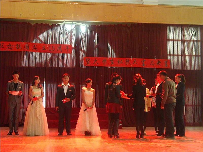 八支参赛队伍分别是:13报货5 6 9 10班,13幼师班,14市场营销一、二班,13旅游管理班、14旅游管理班,13英语、13邮轮2班,13船舶1班,14报货5班,14报货3班,14幼师1班。在由校园广播电台文艺部表演的一段精彩的民族舞蹈之后,总决赛正式开始。现场掌声阵阵,加油呐喊声响彻整个会场,经过一番激烈的角逐和评委老师公正公开的评分后,13报货5 6 9 10班用一首红旗飘飘和一首相亲相爱夺得了本次大赛的第一名,13幼师班通过一首我爱你中国的精彩表演取得了并列第一的好成绩。红歌大赛的第二名由14市场营销1班2班、13旅游班14旅游班、13英语 13游轮2班三个团体获得。本次大赛的第三名由13船舶1班,14报货5班,14报货3班三个团体获得。此外,13旅游班14旅游班、13幼师班、14市场营销班三个团体的指挥凭借出色表演获得本次大赛的“最佳指挥奖”,14幼师班作为表演班级获得了本次大赛最佳组织奖。各位评委老师为获奖班级颁发奖状并在现场留影纪念,相信这会在他们校园记忆中留下美好的回忆。