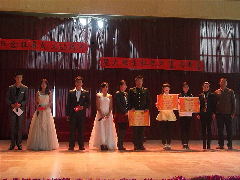 为纪念国庆65周年,讴歌中华民族实现伟大复兴的奋斗历程,颂扬中国共产党的丰功伟绩,激发广大师生爱国、爱党、爱校的热情,增强班级凝聚力,以班风促校风,弘扬四个文明和社会主义主流价值观,我院团委举办了“纪念祖国成立65周年暨大学生红歌大赛”。在2014年10月28日综合馆三楼举办纪念祖国成立65周年暨大学生红歌大赛总决赛。本次大赛的评委老师有:团委书记成名、学生处处长助理吕运福、基础部主任张淑萍、党办主任聂俭丽、网络中心主任薛飞、就业指导中心徐素清、教务处耿炎龙、声乐舞蹈老师王珍妮。各系经过周密部署和层层选拔,八支队伍进入总决赛,经过激烈角逐和评委们公开公正的评分,在阵阵掌声与歌声中总决赛落下帷幕。这不仅是一次红歌的比拼,更是班级凝聚力和校园文化的升华。