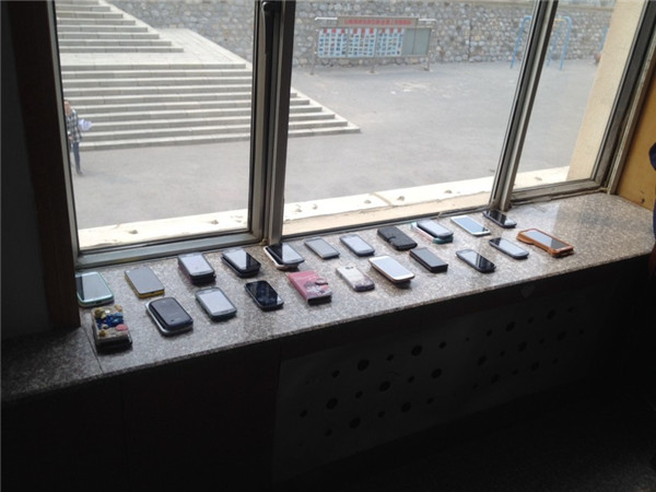 记者们依次采访了13会计班、13会计3班、13船舶1班三个班级的同学。13会计1班的同学们别出心裁的把手机都放在了窗台上,每个手机下面都写着相对应同学的名字,这样一来,谁的手机没有放在上面,谁的手机在上面,一目了然。而其余两个班的同学,则是用彩色口袋把手机挂在了墙上,乍一看,倒成了班级里一道靓丽的风景线。