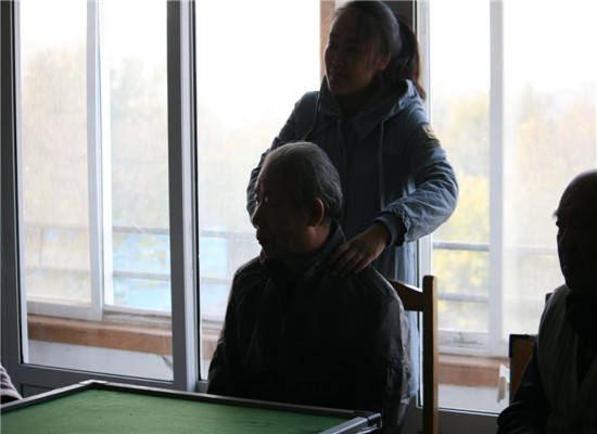 活动的开始,所有人在学校主楼前的花坛集合,大家有秩序的一同走向寿星园敬老院。到达目的地后,爱心敬老团队分成两个小组,第一组同学帮组老人们打水,收拾房间卫生,等劳动。第二组同学们为老人们演唱“父亲”、“母亲”、“再回首”、“弹起我心爱的土琵琶”等许多经典老歌,同学们还为老人们表演小品“太阳当空照”。各式各样的表演形式,精彩绝伦的节目,给老人们带来的不仅仅是欢乐,更多的是年轻人蓬勃的朝气。活动最后社联主席代表大家向老人们献上爱心敬老团队的祝福,每一句话都让老人们非常感动。活动结束后,老人们对我的拜访表示感谢,同时由社联组织的爱心拜访团队表示这样的活动,他们还会继续做下去。